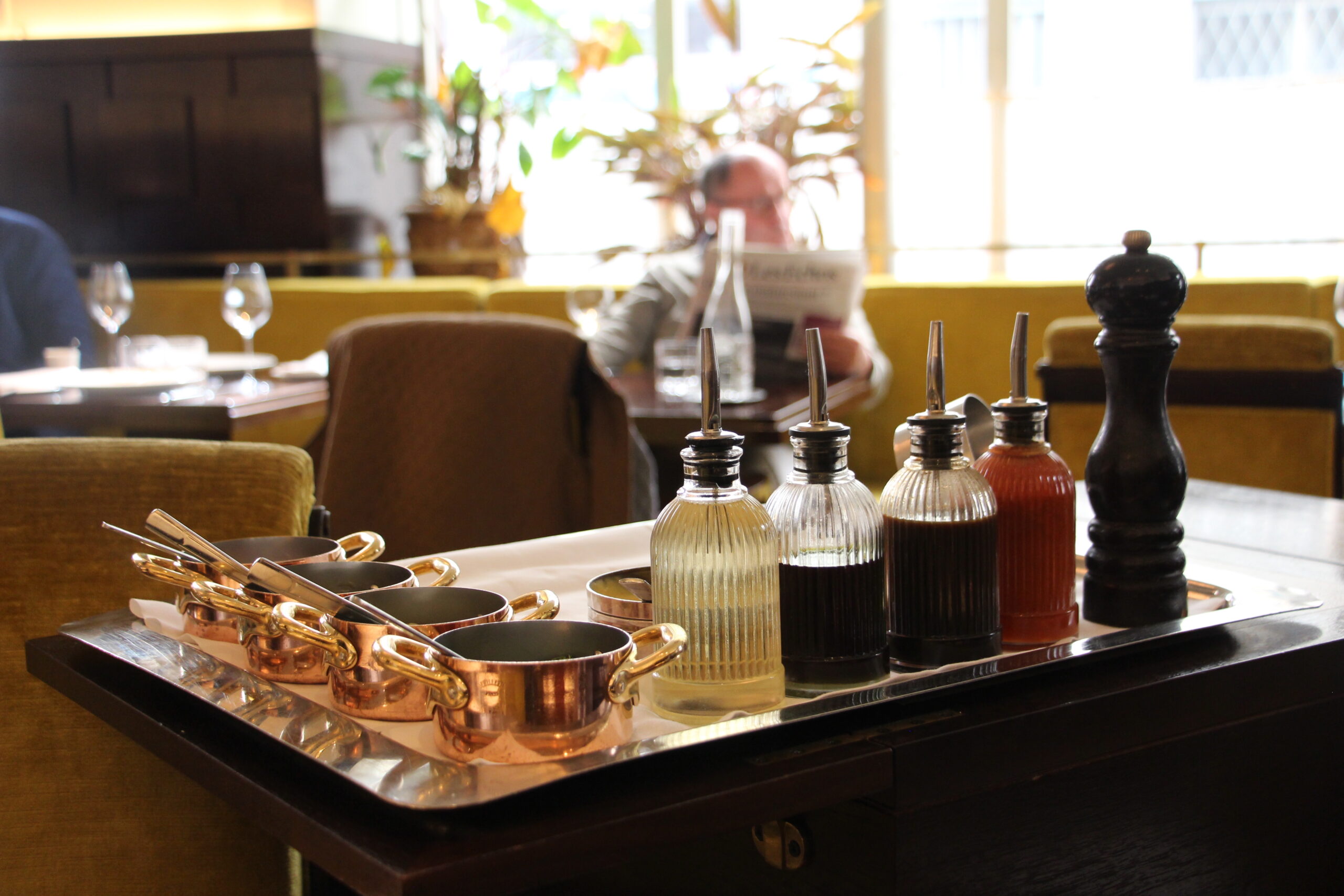 At lunch, a semainier including a leek-vinaigrette appetizer, an ever-changing main of the day, and a café gourmand is on offer for 45 euros; the plat du jour can also be ordered on its own for 28 to 36 euro. I was feeling fancy – and I also wanted to take advantage of the old-school tableside service that makes this space so special – so I opted to order à la carte. (I also skipped wine, seeing as day drinking, as someone I quite like likes to say, no longer “serves the realm,” though the literal book of wines is indeed impressive.)