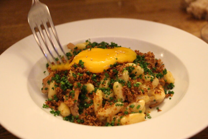 The mains included pigeon (33) and pollack (30), but we both gravitated towards the house-made pasta. On the night of our visit, cavatelli cacio e pepe (28) was revisited with a crispy pangrattato topping, a generous shower of chives, a few plump chanterelles, and an egg yolk designed to be tossed through the cheesy pasta. The noodles themselves were al dente in the way that pasta often is in Italy, which is to say, undercooked for my personal preference, but the flavors were positively perfect.