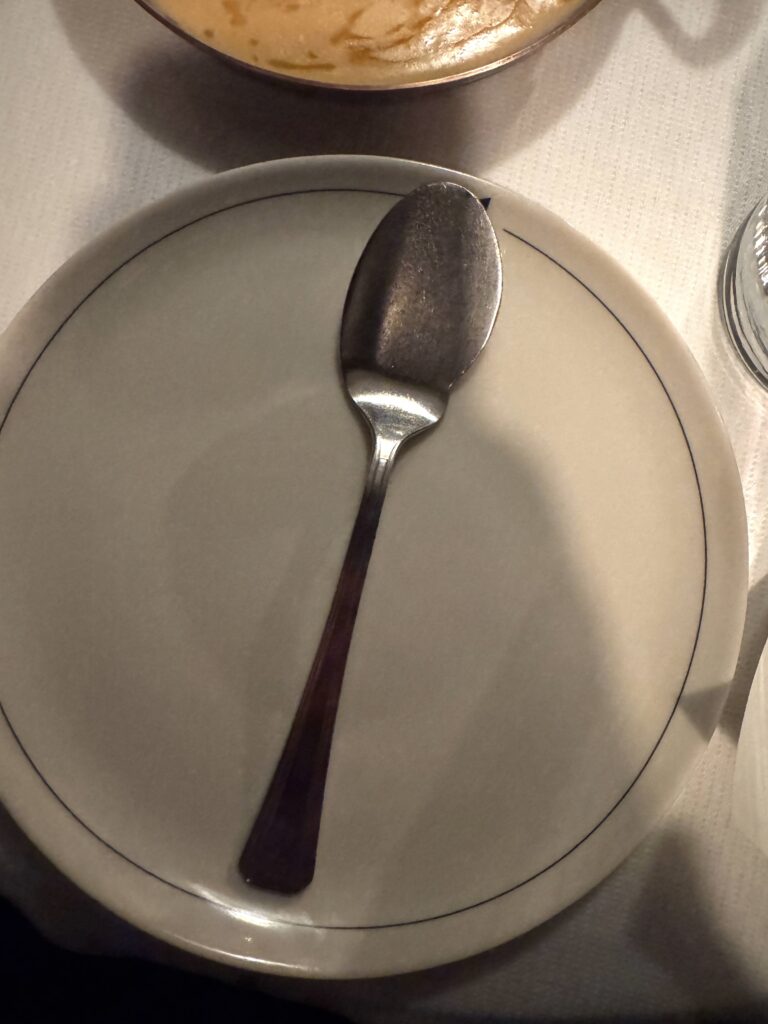 Perkins is a food nerd, pure and simple, and his love of French cuisine and arts de la table shined in the next course, which was served with just one utensil: this odd spoon-ish thing that, he informed us, was a saucier, or a spoon designed to be used to serve oneself sauce from a communal dish.