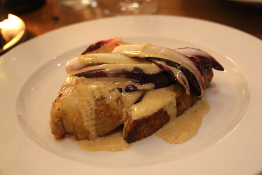 Gougères (8) were hefty and flavorful, filled with a Comté cream tinged with a hint of jalapeño that managed to be flavorful without too overwhelming a kick. One of my tablemates compared them to a gourmet jalapeño popper, and I’m loath to admit that I can’t think of a better comparison, so I’ll quote her instead.