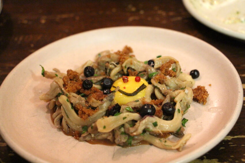 That said, I preferred the other mushroom dish we ordered. Oyster mushrooms (15) were paired here with a Roscoff onion marmalade, which lent a lovely note of sweetness to the earthy pleurotes. Wild blueberries were studded throughout, and a generous rye bread crumble added texture and depth. And the smoked egg yolk smiley face that has become Berzins’ signature was both playful and delicious.