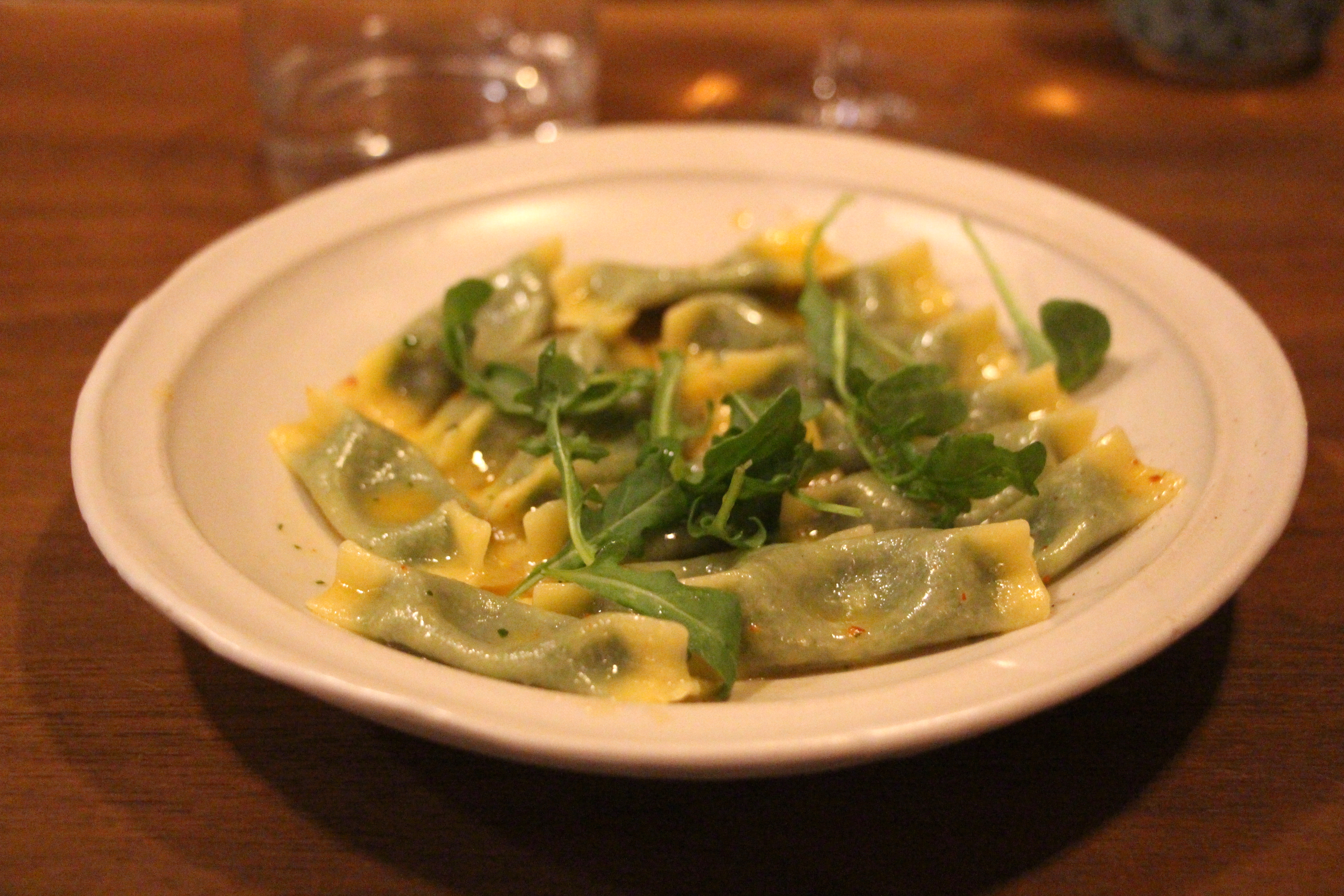The menu, I was told, changed each night, but there was always a vegetarian option. On the night of our visit, it was this dish of scarpinoccs – a pasta shape I’d never heard of! – stuffed with spring garlic and ricotta. Light while also remaining hearty, it was a phenomenally crafted dish.
