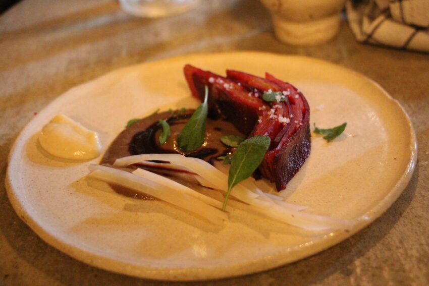 The next dish was undoubtedly my favorite of the night: a fan of smoky, slow-roasted beetroot slices that had been cooked in embers until they were reduced and almost buttery. As with the butternut dish, a panoply of accompaniments joined the beetroot, most of which were pleasantly dominated by horseradish: a beetroot and horseradish purée sat in the middle of the plate, drizzled with a red wine reduction, and a quenelle of house-made horseradish mustard could be integrated (or not) as you liked. On the whole, the plate was giving major roast dinner vibes – and challenged any assertions that plant-based food cannot be comforting.