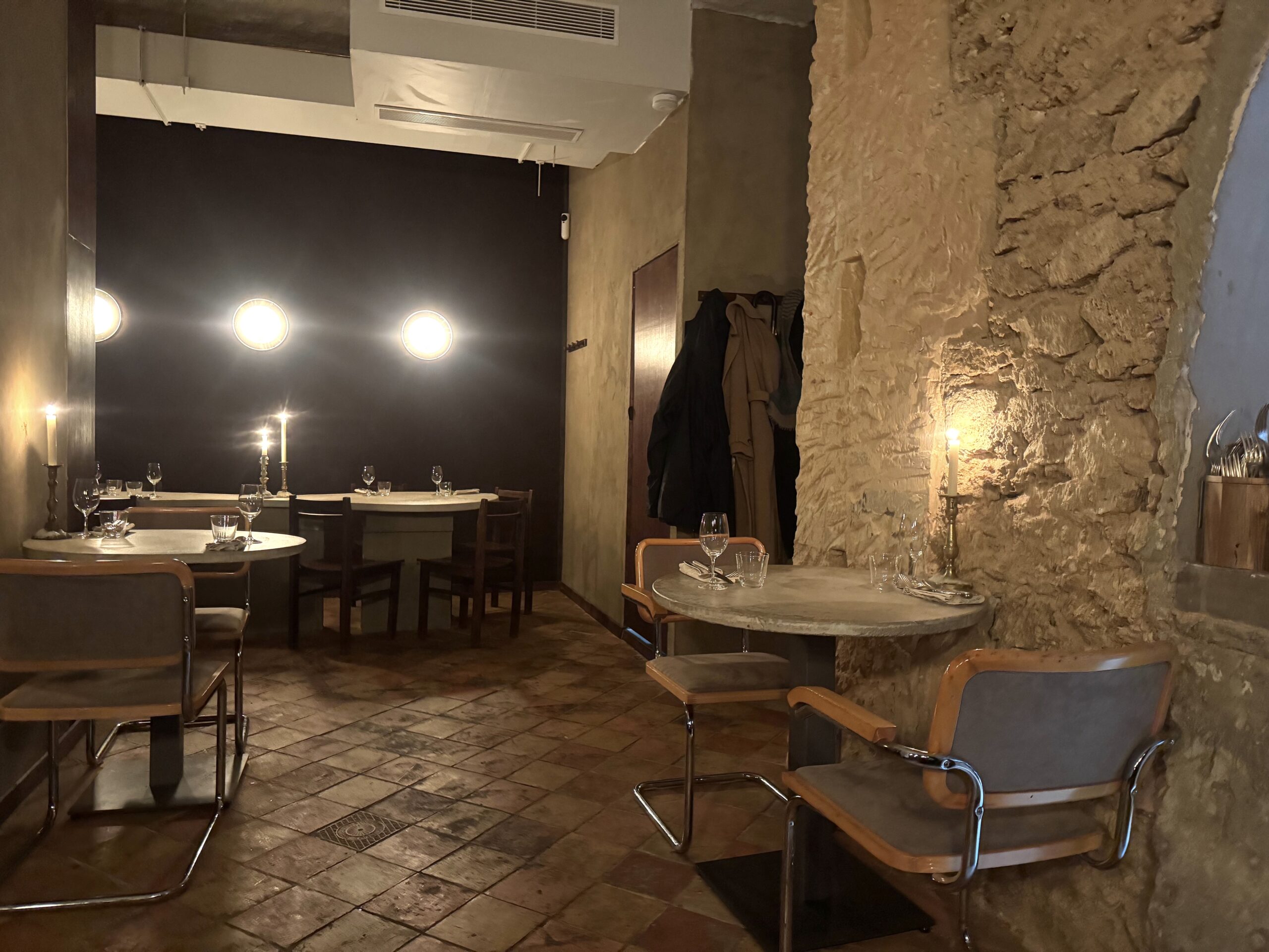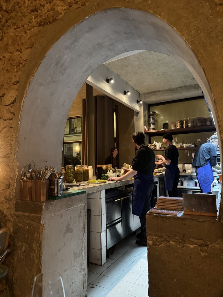 The space is lovely, at once contemporary and evocative of the fine dining approach here, with judiciously spaced tables and tapered candles dripping gorgeously on each concrete table. Each evening, there’s one 75-euro prix fixe on offer – and your first choice is whether you’d like to see it ahead of time or not. (I couldn’t help myself.) You can also opt to add a 45-euro wine pairing, 25-euro non-alcoholic pairing, or 35-euro pairing with a bit of both. Most options on either list are natural and sustainable, in keeping with the philosophy shared by the restaurant’s co-owners, Michelle Primc and Jérémy Grosdidier.