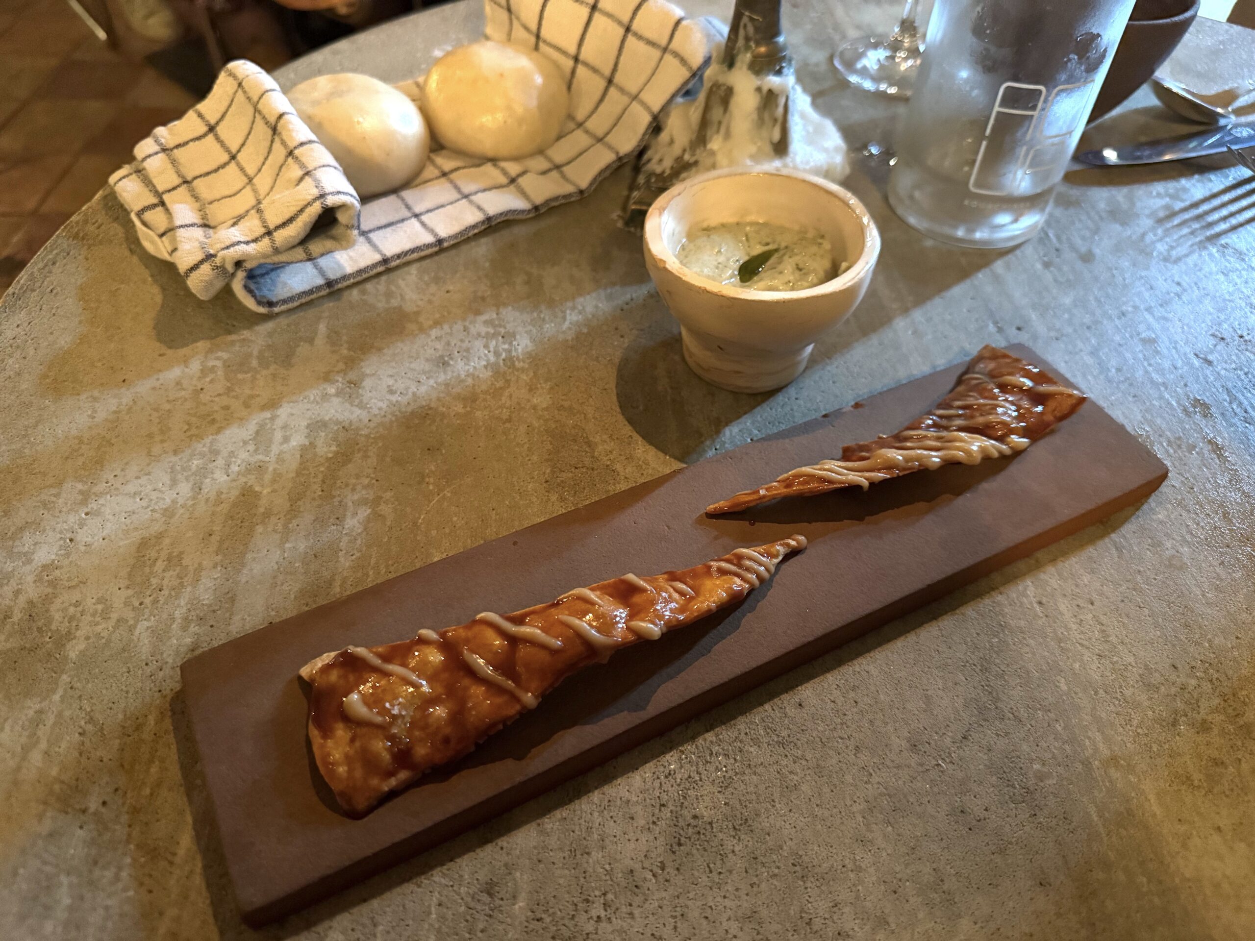The next amuses were also quite tasty: Crackers drizzled with a sweet, umami-rich miso glaze and nutritional yeast arrived alongside bao buns generously seasoned with white pepper and served in a folded dish towel to keep them warm. A small bowl of a smoky tarama-inspired dip made with white beans and seaweed was a clever allusion to the brininess of the original. While all were tasty, I would later wonder if this was the best way to open a meal that otherwise clung to that original promise of Frenchness.